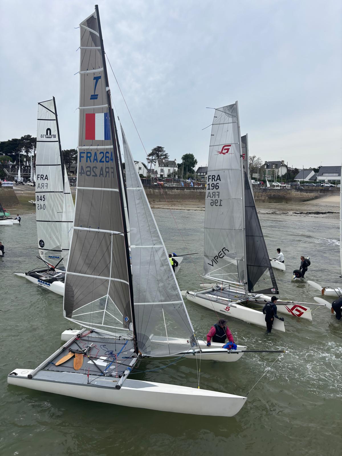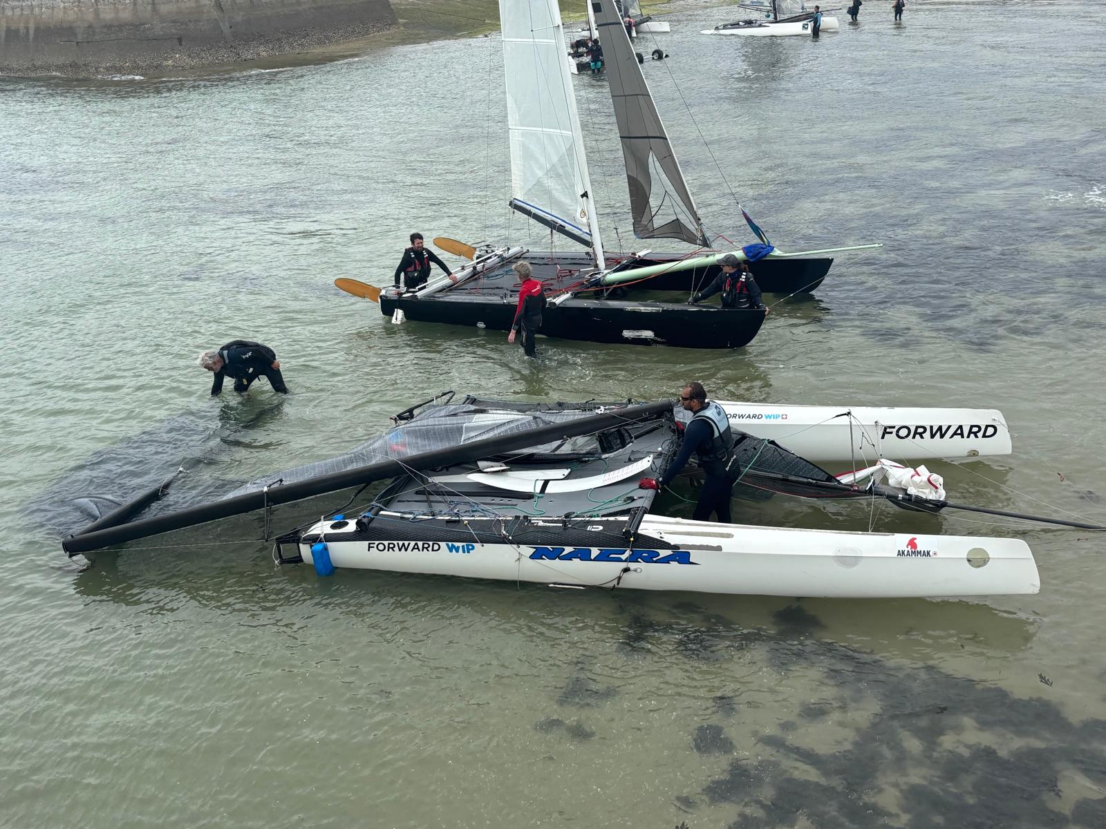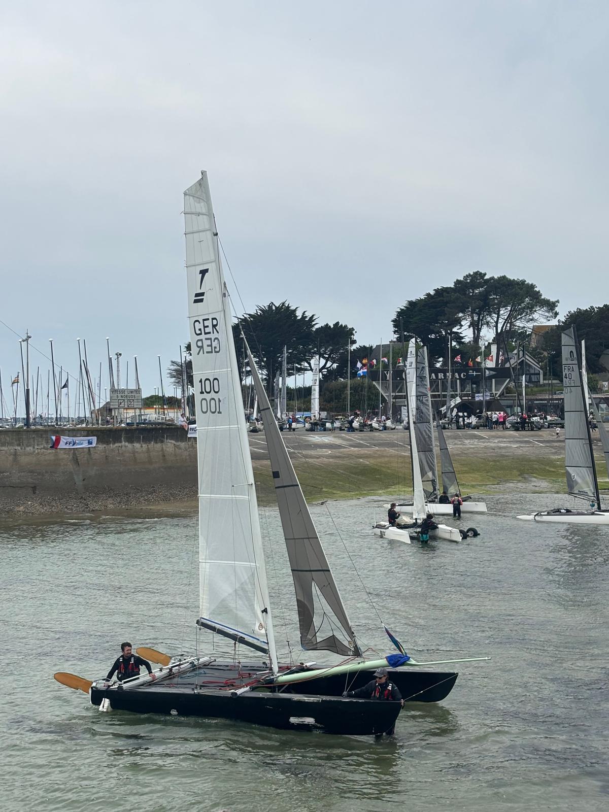 On aura tout de même fait 4 manches aujourd’hui. Le FRA171 reste le meilleur, mais il y a quand même bagarre avec le FRA264 de Laurent et Olivier ainsi qu’avec le FRA131 de Jean-Luc accompagné de Yannick. Un poil plus loin, le GER 100 de Guillaume et Mathilde cherche ses réglages et règles quelques soucis, et enfin le FRA279 de Nico et Matthieu fait comme il peut, ce n’est clairement pas des conditions favorables pour eux (équipage de solides gaillards 😜). C’est un peu frustrant, mais on essaye de relativiser en se disant qu’on est d’abord là pour jouer avec les copains, et que ce sera aussi plus amusant dimanche, où il y a un peu de vent d’annoncé (en espérant que ça tienne). Matthieu