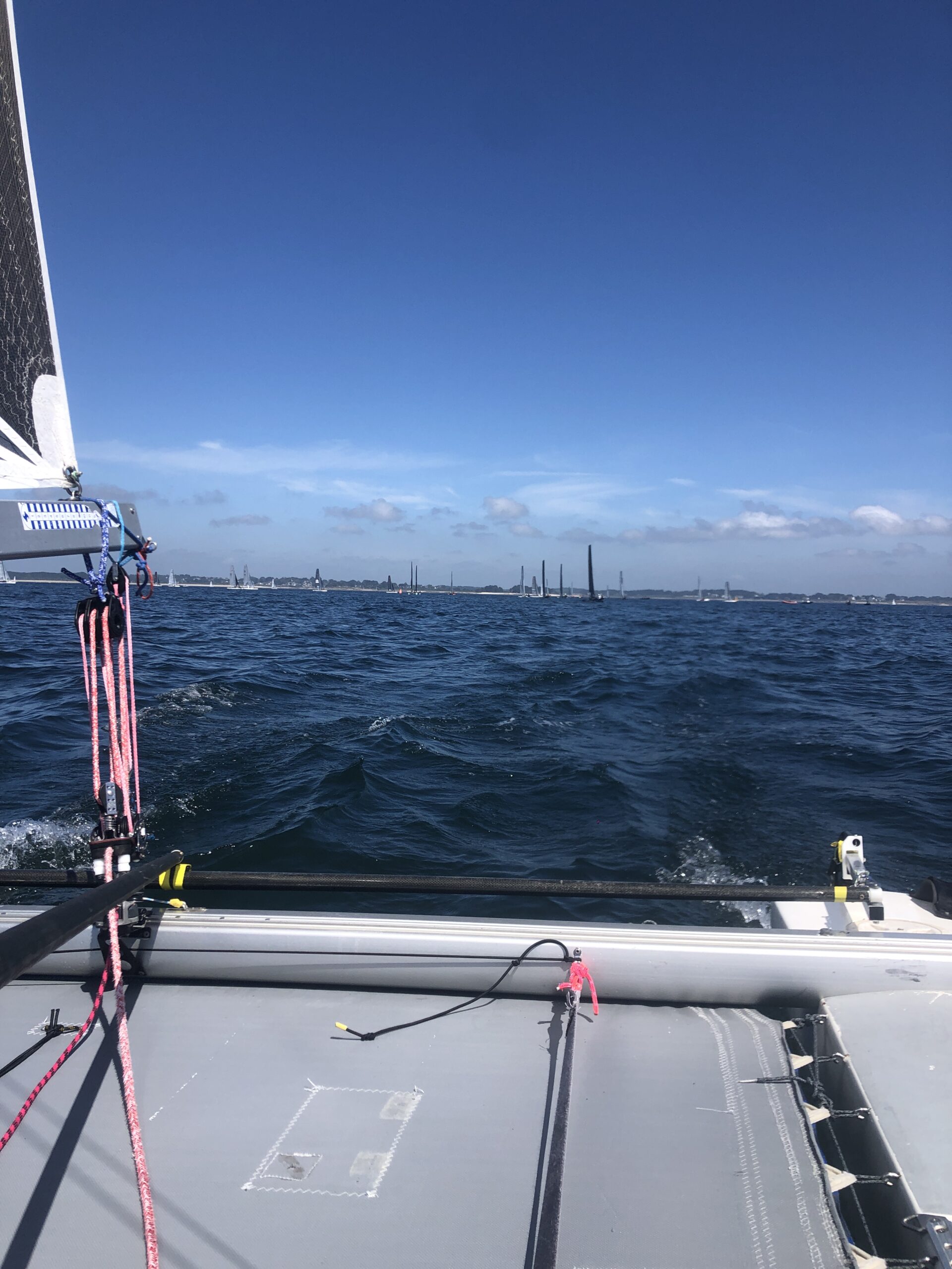 Un grand bravo à Lolo et Oliv’ qui ont bien marchés sur la première moitié, tournant la cardinale Nord Banc de Quiberon en 4eme position. Mais dans ce vent plutôt faible, les récents F18 et F16 menés par d’autres marins talentueux ont réussi à les rattraper puis dépasser sur le fil à la ligne d’arrivée. Ils se retrouvent tout de même à une belle 10ème place au scratch, et une plus belle 3ème place en C1.