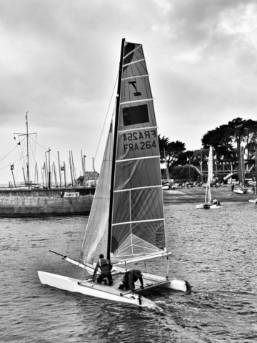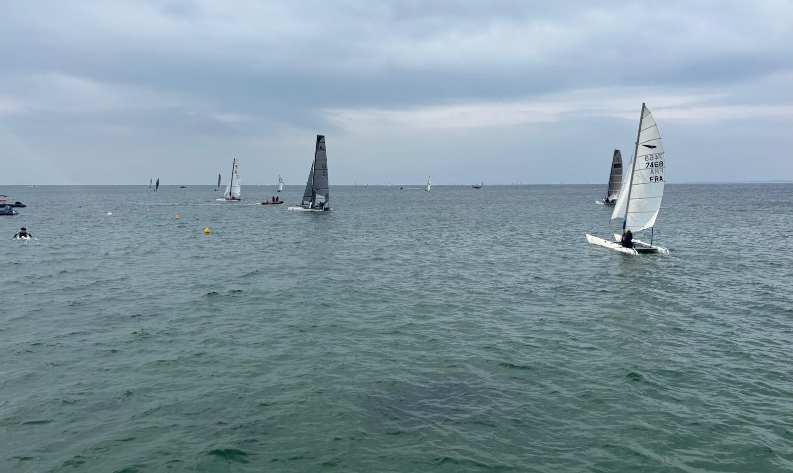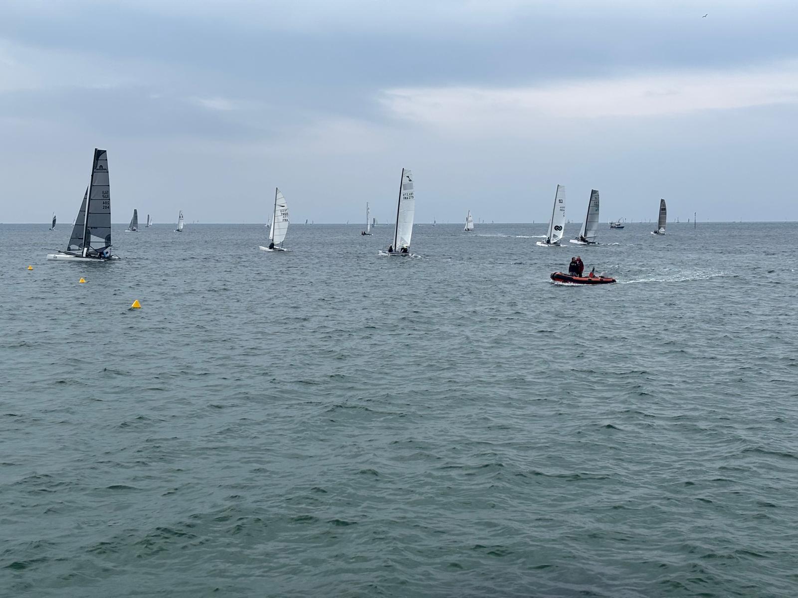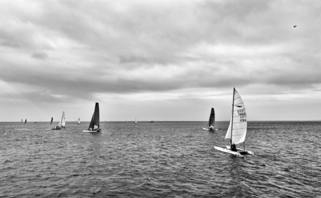 Le comité a décidé de ne garder sur notre rond uniquement les F18 et les C1 en départs différés. Les nacra 15 sont allés sur le rond des darts et HC16. Tant mieux, car l’engagement à la ligne reste le même, mais faut tout de même éviter la casse. Il y a des dessalages, pas chez les tornadistes. La lutte est intense, les snuffers et les spi se mouillent, les envois et les affalages sont intenses. Les remontées au près deviennent des moments de détente tant les transitions sont exigeantes pour les équipiers. Et en même temps, on se régale. Le plaisir est là. On aura trois courses ce dimanche, suffisamment pour nous satisfaire.