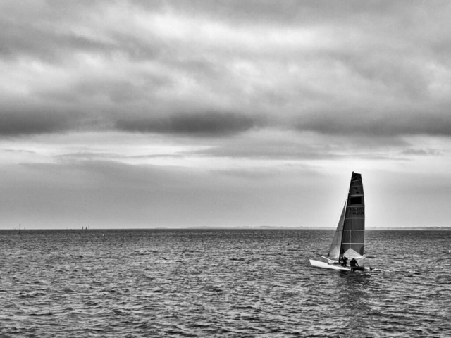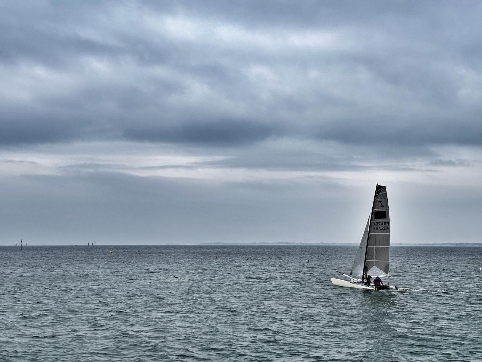 Aaaaaaaahhh ! Enfin du vent ! NE, 18-25 nds, un peu irrégulier, les risées sont plus coquines. Ça va être vachement plus drôle ! On va enfin pouvoir sortir au trapèze. La marée est montante, toujours en petit coefficient.